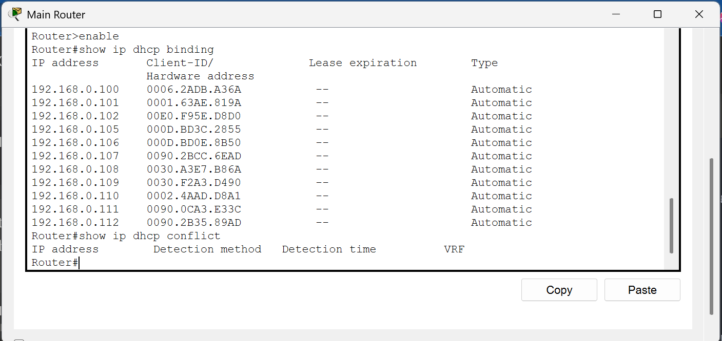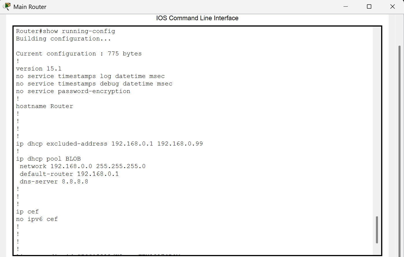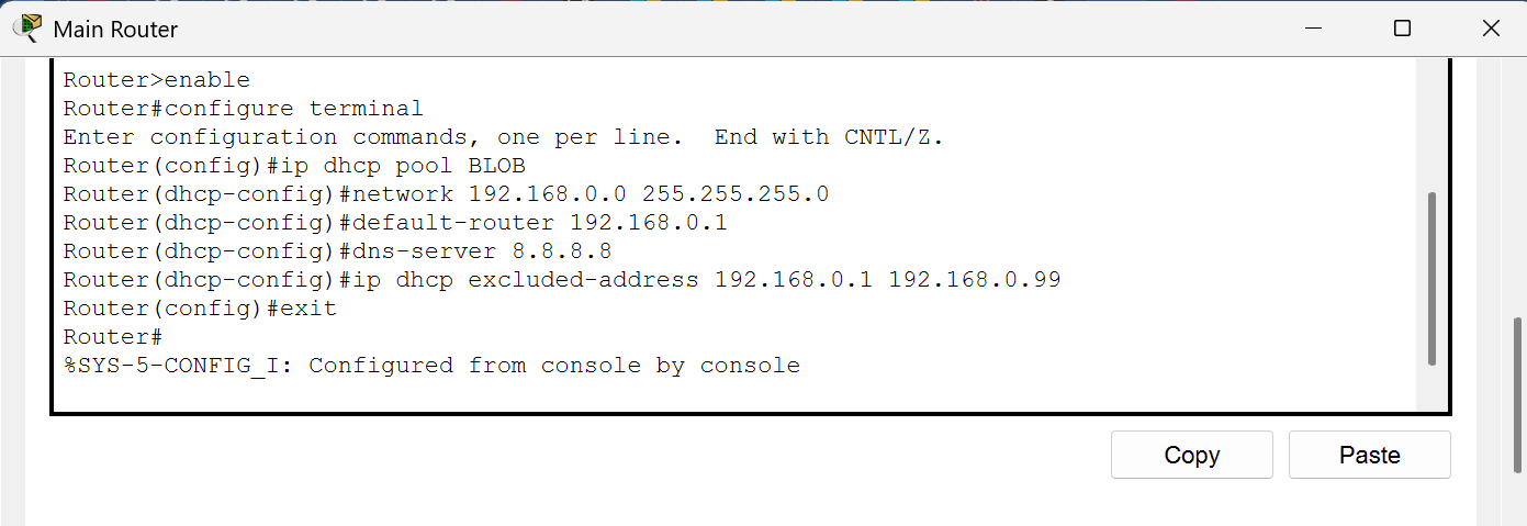 ! DHCP Configuration Template ip dhcp pool BLOB network 192.168.0.0 255.255.255.0 default-router 192.168.0.1 dns-server 8.8.8.8 ! Exclude Static IP Addresses ip dhcp excluded-address 192.168.0.1 192.168.0.99 ! Verification Commands show ip dhcp binding show ip dhcp pool show ip dhcp server statistics