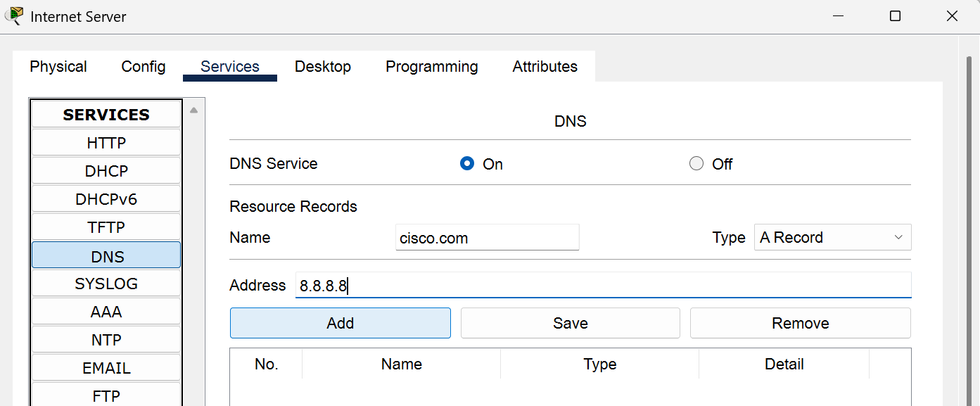 Figure 7: Configuring DNS on the Internet Server with cisco.com and its IP.