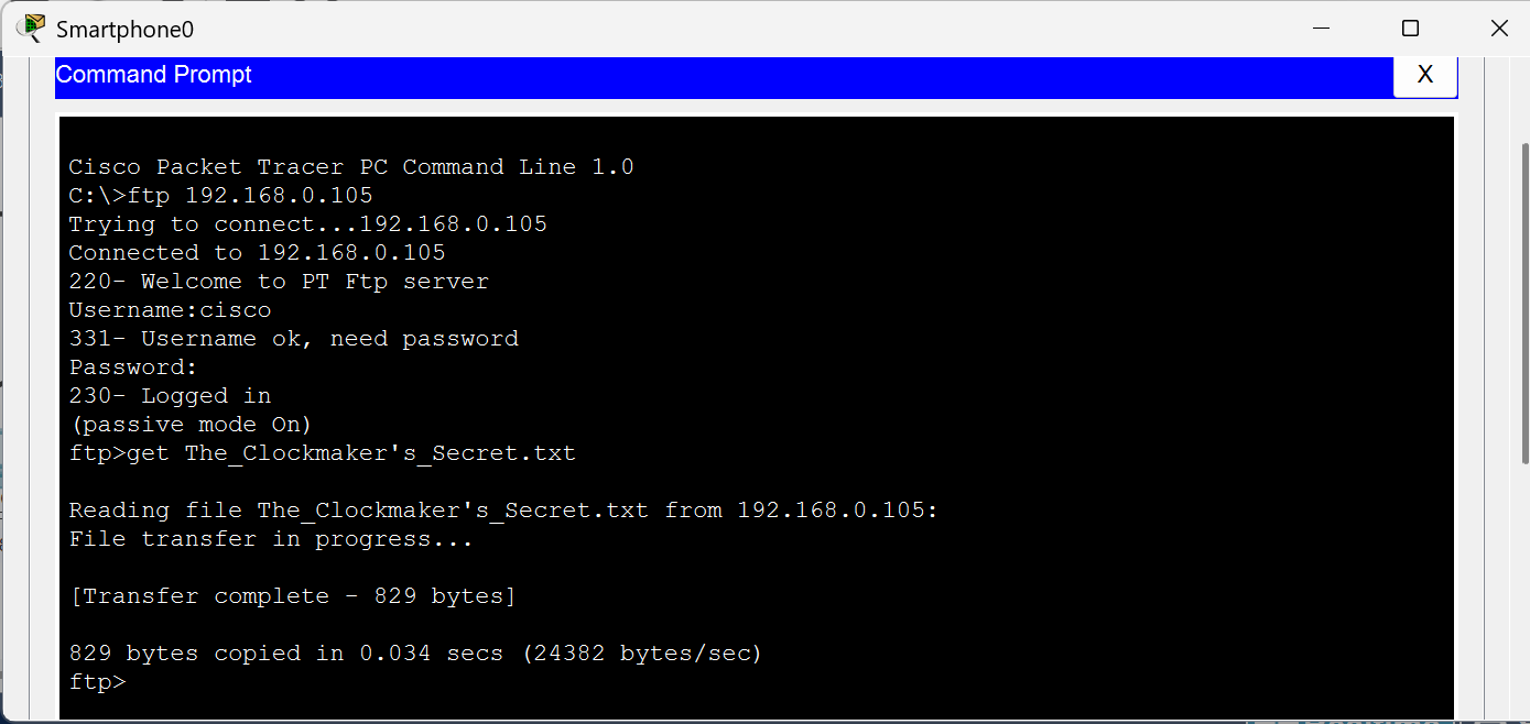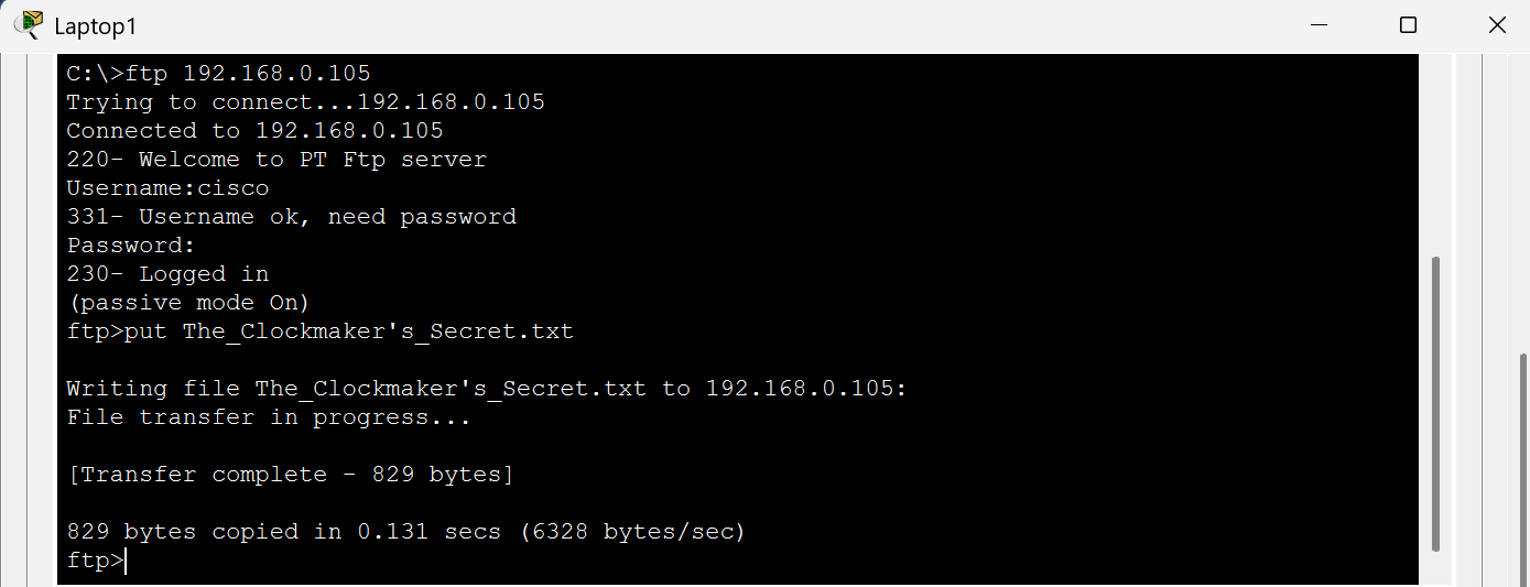 ftp 192.168.0.105 username: cisco password: [enter password] put The_Clockmaker's_Secret.txt