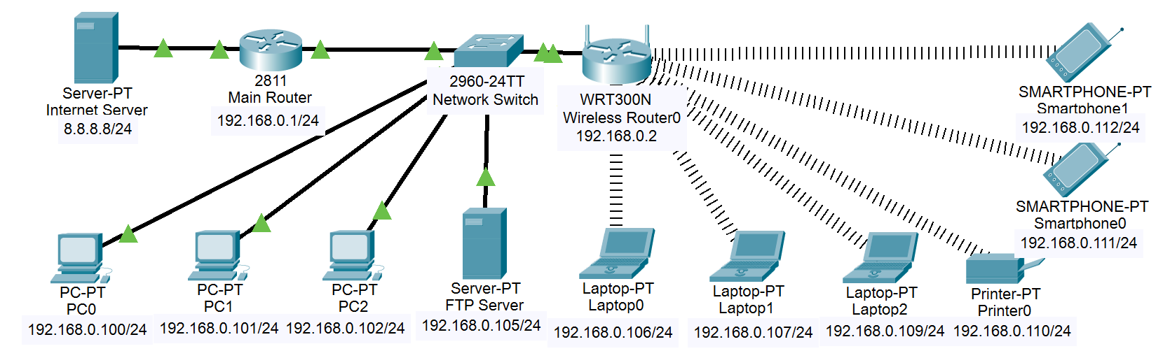 | Workstations | 192.168.0.100 - 192.168.0.105 | Desktop computers and FTP Server |