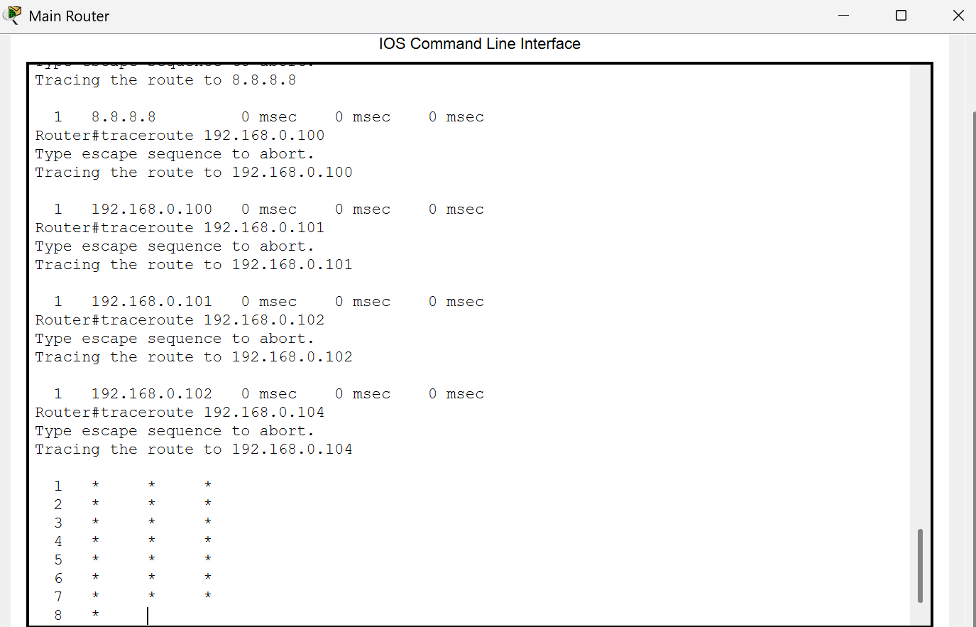 Figure 6: Traceroute verification comparing existing IPs (8.8.8.8, 192.168.0.2) with a non-existent IP (192.168.0.104).